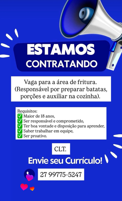 Exibir dicasCuidado com ofertas de emprego que solicitam o pagamento de taxa, exame admissional ou compra de certificados de cursos.
