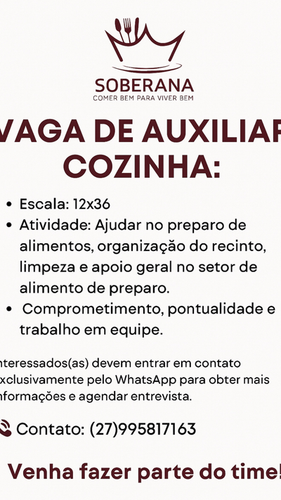 Auxiliar de Cozinha: Interesse e/ou experiência em auxiliar no preparo de alimentos, organização da cozinha, limpeza e apoio geral ao(à) cozinheiro(a).