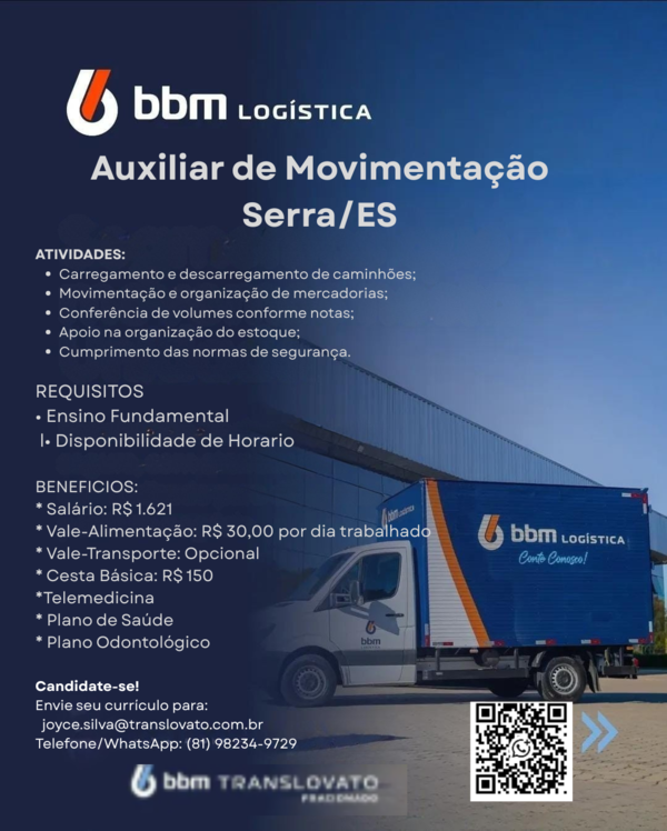O profissional será responsável por realizar atividades de movimentação de mercadorias, auxiliando no carregamento e descarregamento de veículos, garantindo a organização e integridade dos produtos durante o processo logístico.