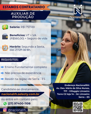 Benefícios: VT + VA (R$ 560,00) + Seguro de vida