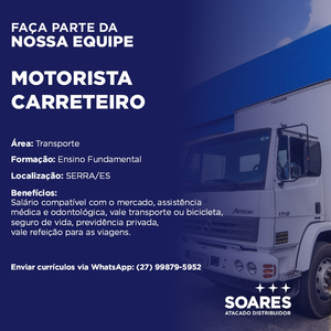 Benefícios: Salário compatível com o mercado, assistência médica e odontológica, vale transporte ou bicicleta, seguro de vida, previdência privada, vale refeição para as viagens.