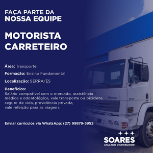 Benefícios: Salário compatível com o mercado, assistência médica e odontológica, vale transporte ou bicicleta, ATRON seguro de vida, previdência privada, vale refeição para as viagens.
