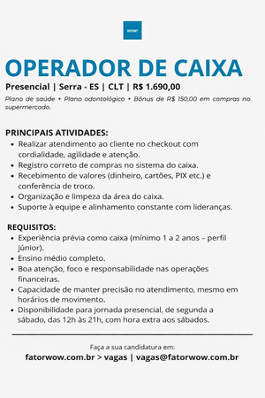 Experiência prévia como caixa (mínimo 1 a 2 anos - perfil júnior).