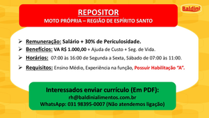 Requisitos: Ensino Médio, Experiência na função, Possuir Habilitação "A".