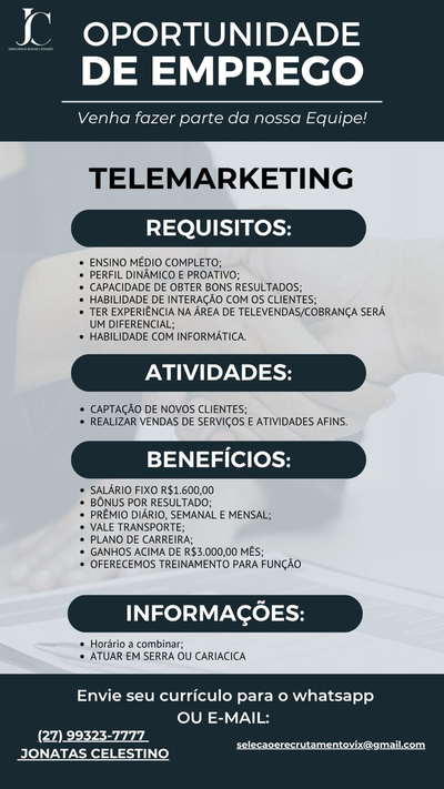 TER EXPERIÊNCIA NA ÁREA DE TELEVENDAS/COBRANÇA SERÁ UM DIFERENCIAL